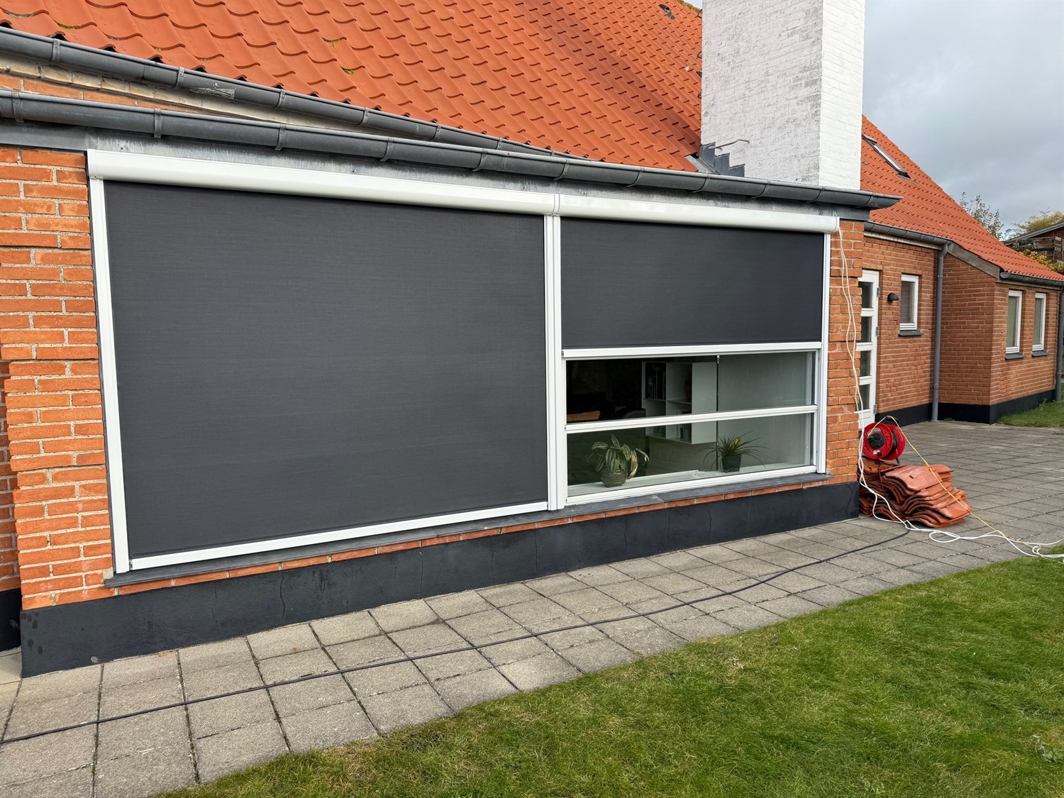 Udvendigt rullegardin - screen - er en optimal løsning til udvendig solafskærmning af både små og større vinduespartier. Systemet kører vertikalt i sideskinner (lynlås) ned foran vinduet.
